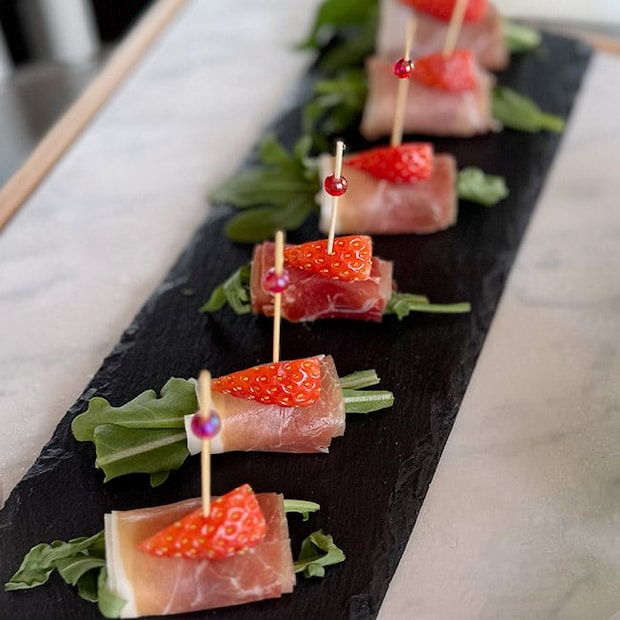「生ハムとイチゴとセルバチコの盛り合わせ」も、花束のようで美しい見た目。ジューシーな生ハムと、甘酸っぱいいちごの組み合わせが最強です。延々と食べていたくなるほどおいしくって、本当に幸せ。