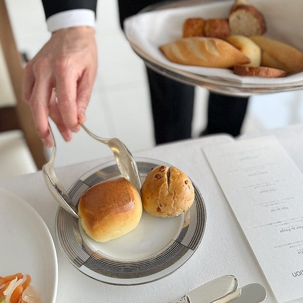ここでパンが運ばれてきました。こちらのレストランでは、焼きたてのパンもいただけるんです。パンのお供は、イタリアのバージンオリーブオイル、カマルグの塩、ホイップバター、そしてカカオバターが用意されています。