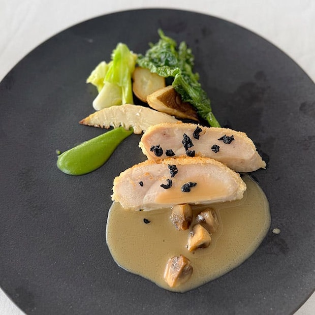「信玄鳥のアーモンドクルート焼き オリーブのアクセント ソーススュプレーム」です。信玄鶏はしっとりと柔らかな口当たり。砕いたアーモンドをまとわせ焼き上げているから、サクッと軽やかな食感とナッツの香ばしさも。
