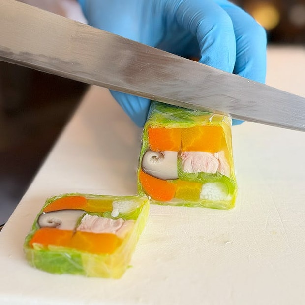 お次は、シグネチャーメニューの「マンハッタン特製テリーヌ」を。まるで芸術品を思わせる美しいビジュアル。肉をはじめ、椎茸、にんじんなど、具材がぎっしり。まろやかで甘酸っぱいソースとよく合います。