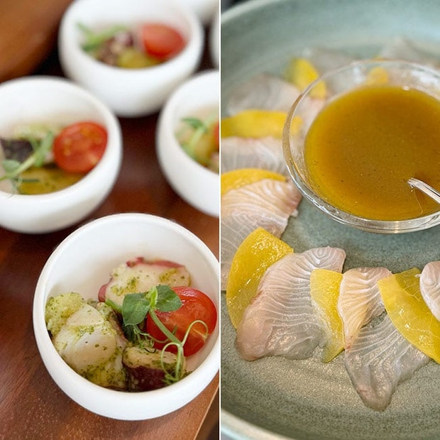 「カンパチのアグアチレソース」です。アグアチレソースはメキシコのソースで、ライム果汁や唐辛子などを合わせているそう。辛さは控えめで、カンパチと黄桃が相性抜群。