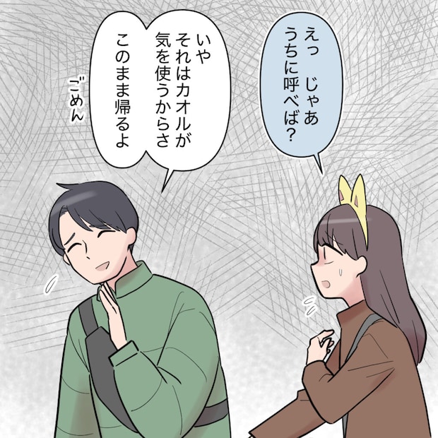 「えっ、じゃあうちに呼べば?」そう提案してみたものの、「いや、それはカオルが気を使うからさ、このまま帰るよ」と、あっさり断られてしまいます。シンジは私に軽く謝ると、そのまま背を向け、私を残して駅の方向へと走っていきました。