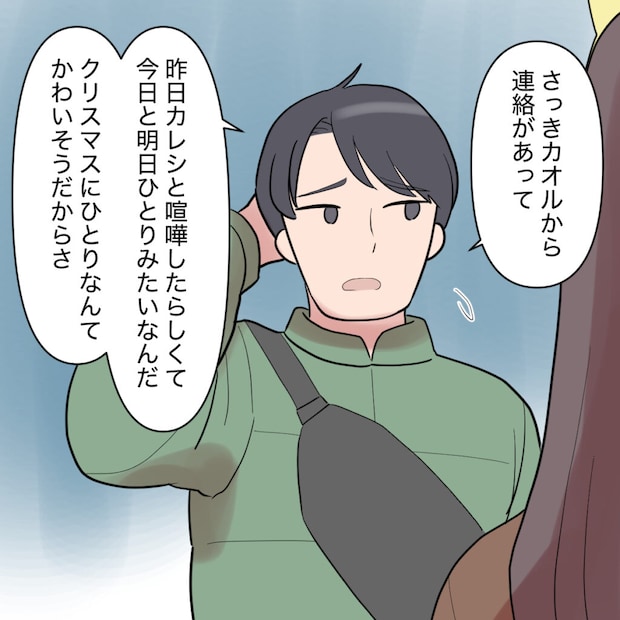 するとシンジは少し気まずそうに「さっきカオルから連絡があって、昨日彼氏と喧嘩したらしくて今日と明日ひとりみたいなんだ・・・クリスマスにひとりなんてかわいそうだからさ」と言いました。