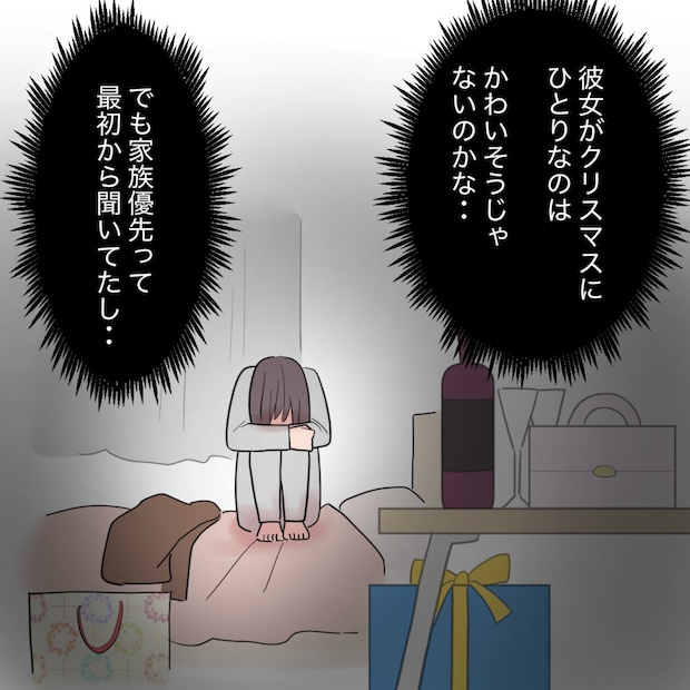 妹がクリスマスにひとりなのはかわいそうなのに、私がひとりになるのはそう思わないのかな。ひとりで帰宅した私は、用意していた料理にもケーキにも手を付けず、ベッドの上で身を丸めて泣きました。だけど、家族優先ということは最初から聞いていたし、分かった上で付き合っているのも自分。何よりシンジのことが大好きだったから、別れを選ぶことはできませんでした。