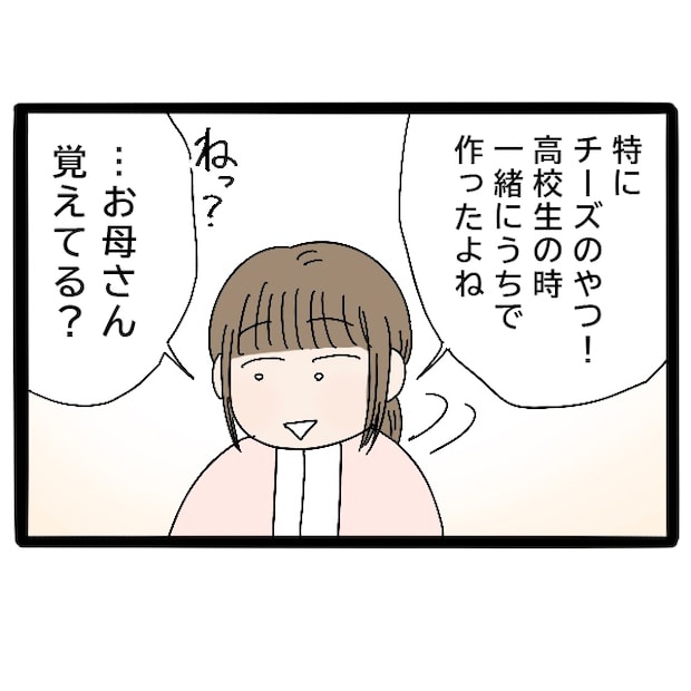そして「特にチーズのやつ!高校生の時、一緒にうちで作ったよね。ねっ?・・お母さん覚えてる?」母のいる方向を見ながらそう言うと、