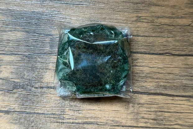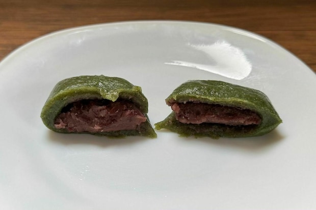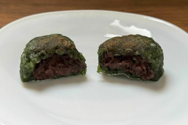 濃厚なよもぎの香りが食欲をそそります。あんこをサンドしたような形状が特徴的で、横から見ると挟まれたあんこを確認できます。実際に割ってみると、中には粒餡がしっかりと入っていることがわかります。