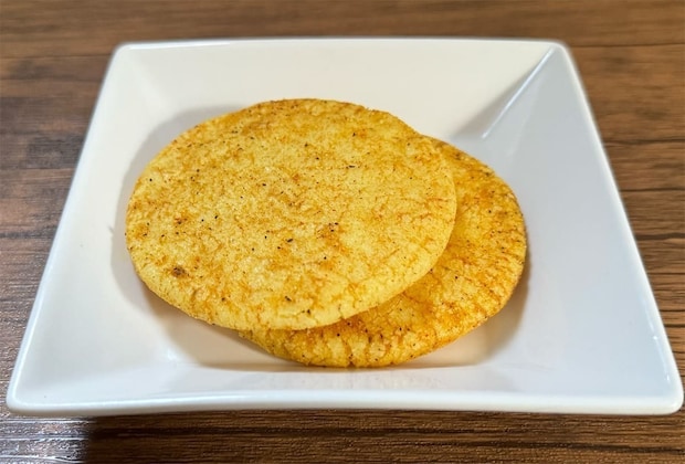 国産のうるち米を使用し、ふっくらと香ばしく、ソフトな口当たりに焼き上げられています。袋から出すと香ばしいカレーの香りが漂い、中には手のひらサイズほどの煎餅が2枚入っていました。