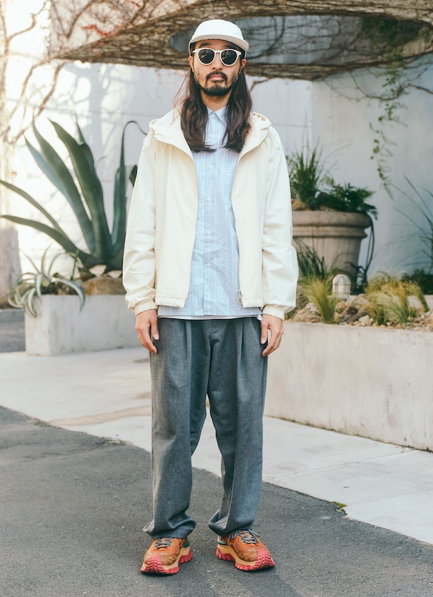 清涼感のあるブルーストライプのシャツに、ホワイトパーカーを重ねたたくみさん。グレーのボトムでコーデ全体をほどよく引き締め、足元は『モンクレール×サレヘ・ベンバリー』のスニーカーで存在感たっぷりなアクセントを。サングラスやハットなど小物をホワイトでまとめたクリーンな着こなし。