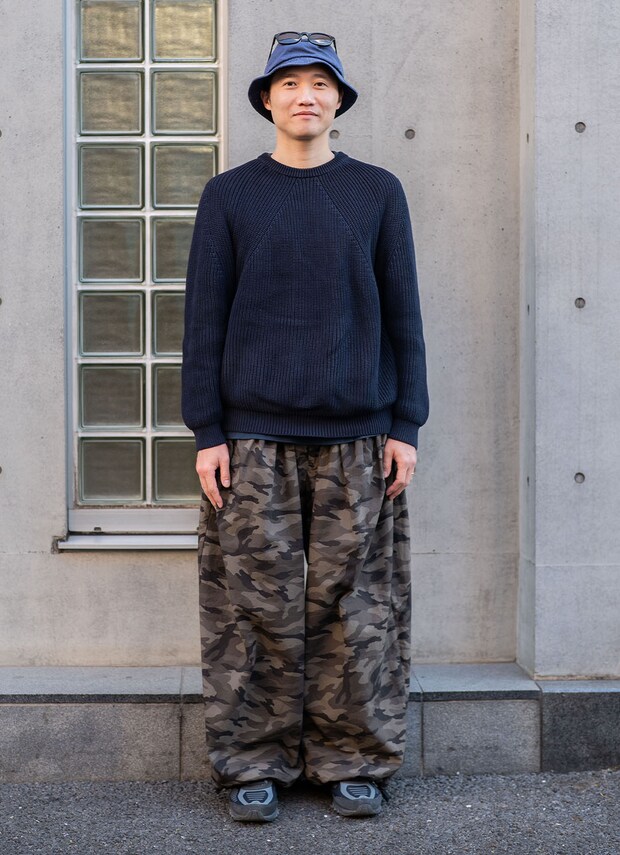 ボリュームたっぷりなカモフラボトムを軸に、ローゲージニットでバランスを取った今成さん。シンプルながらニットの切り返しデザインなど、細部にこだわった着こなしがポイント。全体をダークカラーでまとめることで落ち着いた雰囲気に。デニムハットを合わせてストリートに仕上げて。