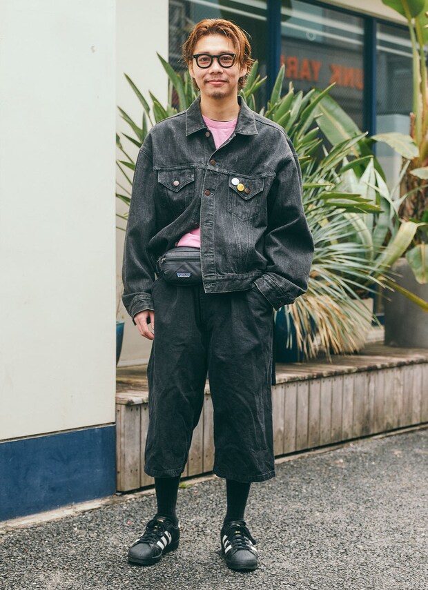 ブラックデニムのジャケットとボトムをセットアップで着こなして、「スーパースター」で足元に軽快さをプラスしたワントーンコーデ。ジャケットのフロントボタンは軽く外して、インナーのピンクシャツを差し色に。胸元につけた缶バッジやさりげなく主張するウエストポーチがポイント。