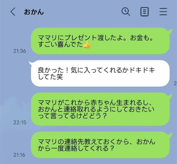私的に何だか納得がいかなくて、それに気づいた夫が「じゃあお母さんにLINE教えてもいい?」って聞いてみるね!と言ってくれて、LINEをしてくれました。
