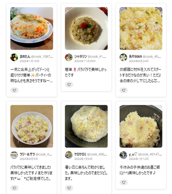 つくれぽ(つくりましたフォトレポートのこと)にも「簡単でパラパラで美味しかったです!」「仕事帰りでも炊飯器で簡単楽チン助かりました!」など、絶賛コメントがたくさん届いています。