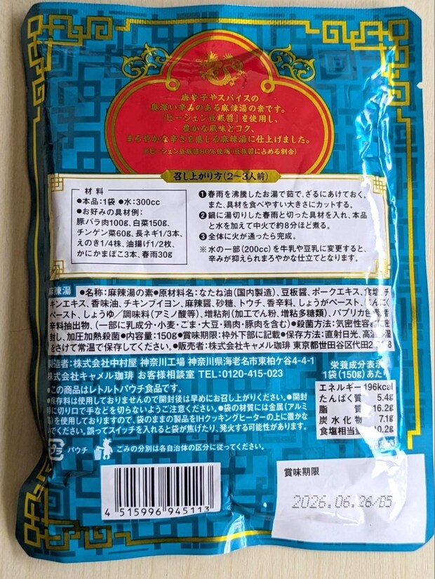 まずは、レトルトパウチの「麻辣湯」。濃縮タイプで1袋2〜3人前です。