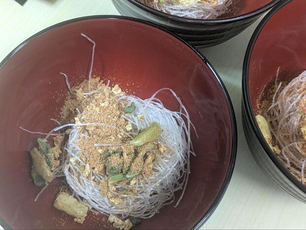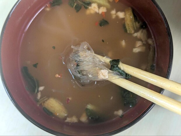 春雨とスープをお椀に開けてみました。インスタントスープとは思えないほど、本格的な香りがします。