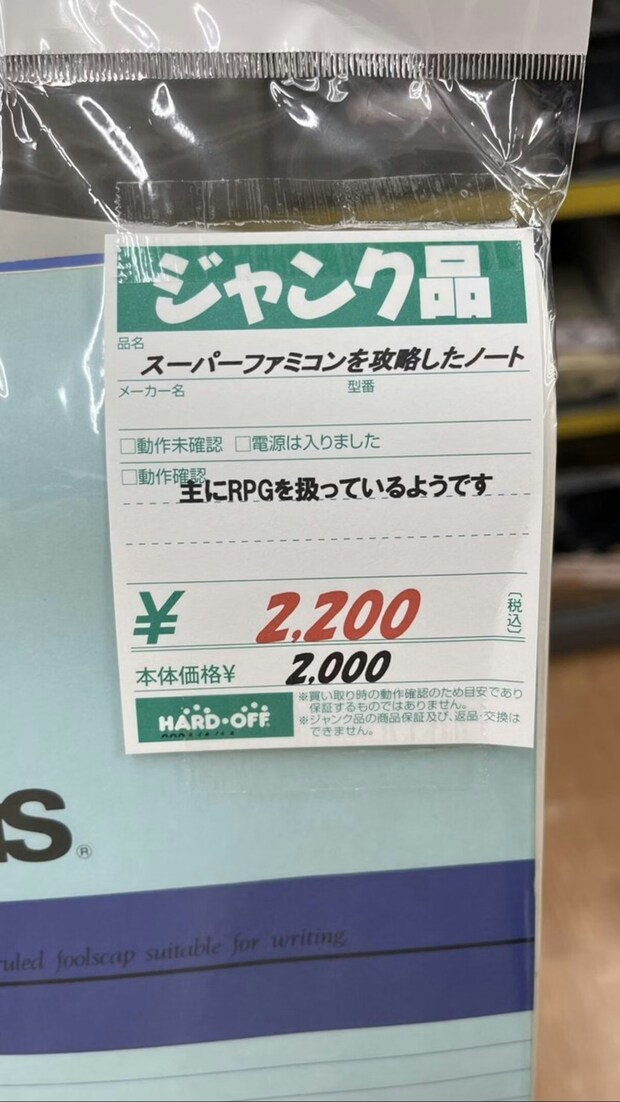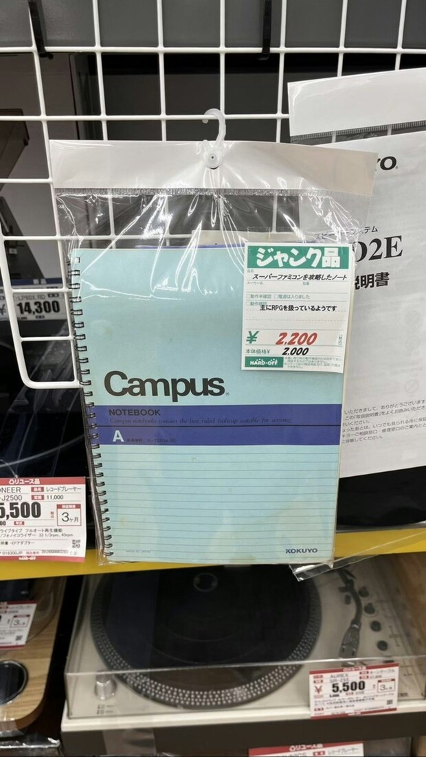 投稿者・8bitさんは「ハードオフ」で、とある1冊のノートを見つけたそう。ただのノートと思いきや、それは中身が気になって仕方がなくなるノートだったようです。8bitさんが見つけたのは、RPGゲームを中心とした攻略方法を記載した手書きノート。いったい誰がどのくらいの歳月をかけて作成したのか…想像力がかき立てられるそのノートに、Xではさまざまな声が投稿されて盛り上がっていました。※投稿者が店舗内を撮影する際、店舗に許諾を得ています