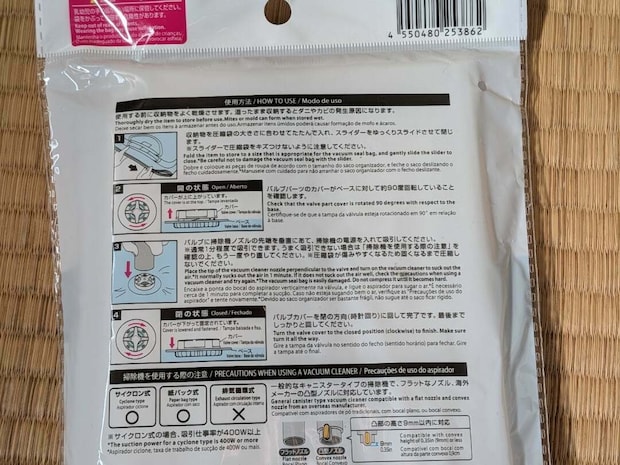 掃除機のホースを差し込み、空気を吸い出したら、素早くスライダーを閉めて完了!