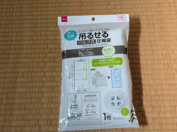 3つ目は、「ダニ対策吊るせる衣類圧縮袋(仕切り付)」で330円の商品です。