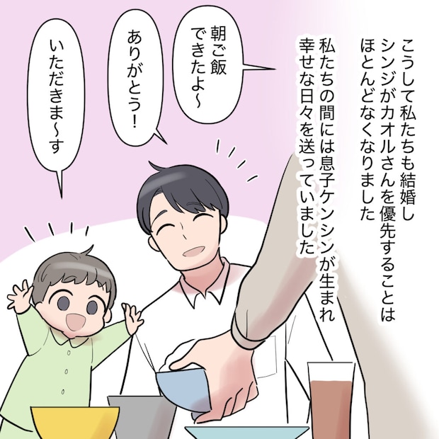お互いに家庭ができたこともあり、結婚してからはシンジがカオルさんを優先することはほとんどなくなりました。やがて私たちのもとに息子のケンシンが生まれ、家族3人で幸せな日々を送っていました。