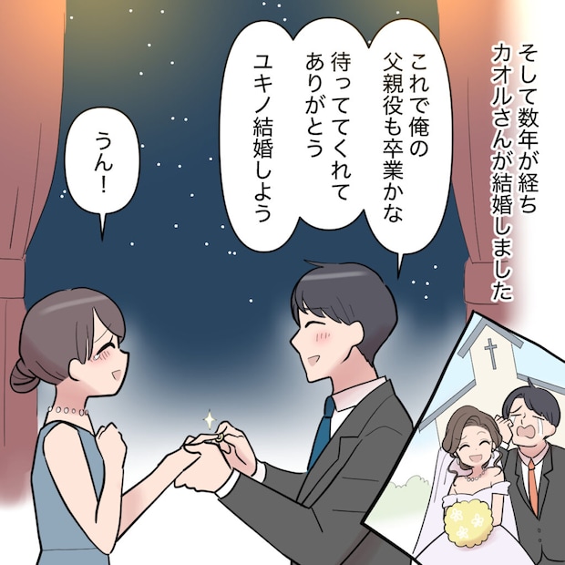それから数年が経ち、カオルさんが結婚しました。「これで俺の父親役も卒業かな・・・待っててくれてありがとう、ユキノ結婚しよう」シンジはそう言って、私の薬指に指輪をはめてくれました。付き合っていた頃、カオルさんを優先するシンジに憤りを感じたこともあったけど、これでようやく2人の人生が始まります。