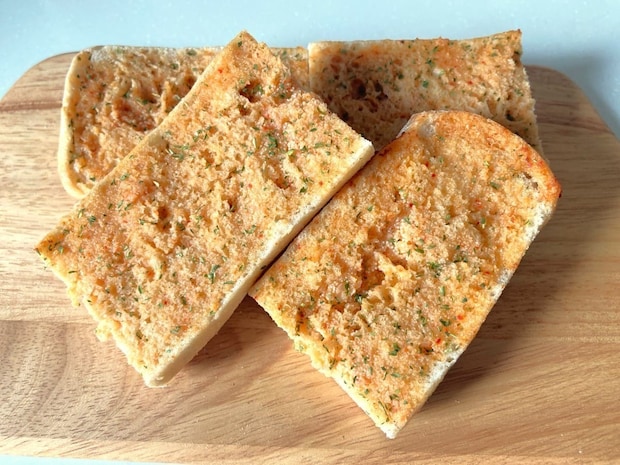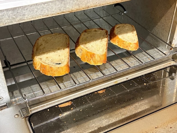 カットしたパンにガーリックバターを塗ってトースターで焼きます。