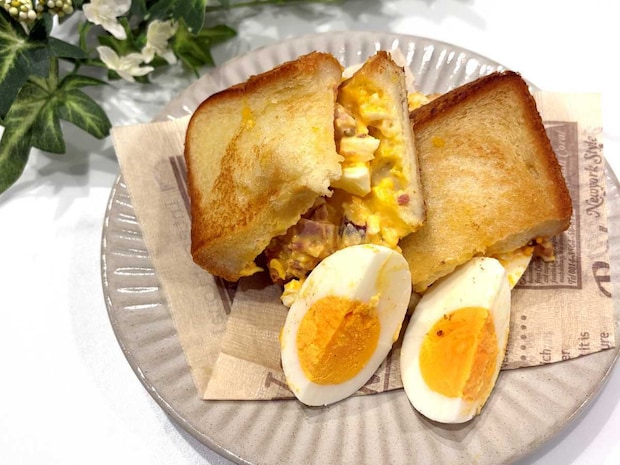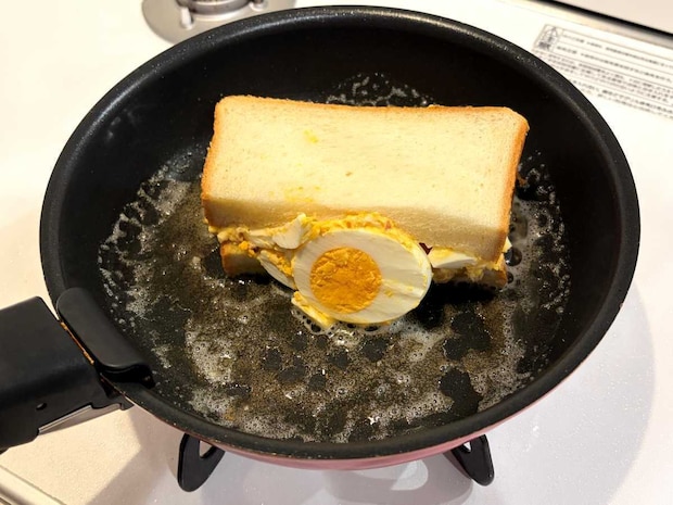 アレンジとして、バターを敷いたフライパンでこんがり焼いてみたところ…もちもちの食パンが「外カリッ!中ふわっ!」になって、食感のコントラストがたまらない絶品サンドに!