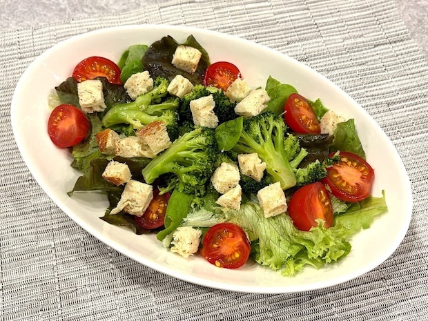 また、アレンジとして、クルトンのように小さくカットしてサラダにトッピングしてみました。サクッとした歯ごたえが加わることで単調になりがちなサラダが食べやすくなり、食感と満足感を一気に引き上げてくれます。