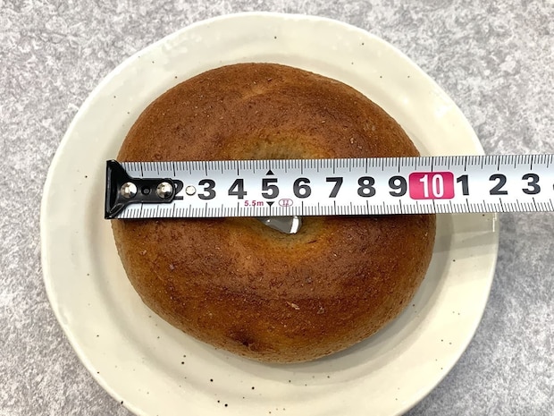 サイズは約10cmと手のひらよりも大きく、手に持つとかなりのずっしり感があります。1個食べるだけでお腹がいっぱいになりそうな、コストコらしいボリューム感のあるベーグルです。