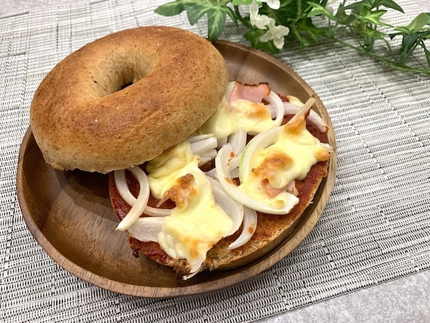 今回はこのホールウィートベーグルを使用し、アレンジ料理としてベーグルピザを作ってみました。分厚いため半分にカットしやすく、そこにチーズ、たまねぎ、ハム、ピザソースを加えてオーブンで温めます。