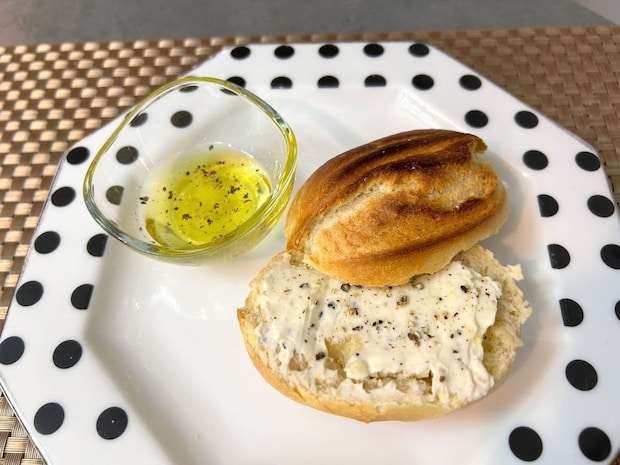 アレンジとして、クリームチーズを塗り、塩、黒こしょう、オリーブオイルをかけて食べてみました。クリーミーなチーズと塩気が香ばしいパンと合い、簡単ながらお酒にも合う絶品のアレンジでした!