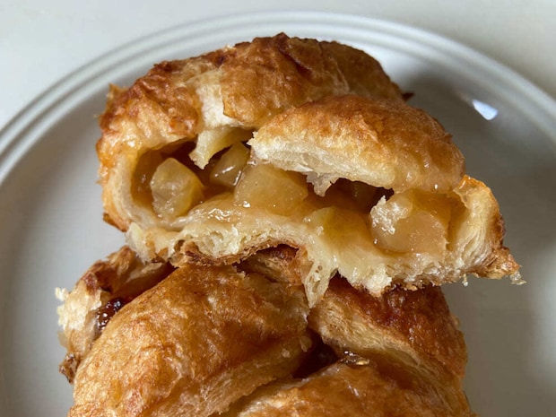 サックリとした生地の中からはとろとろのアップルフィリングが出てきます。小さめの角切りにされたりんごがたっぷりと入っており、甘酸っぱさとほんのり香るシナモンの絶妙なバランスが特徴です。加熱によって香りや食感が引き立ちます。