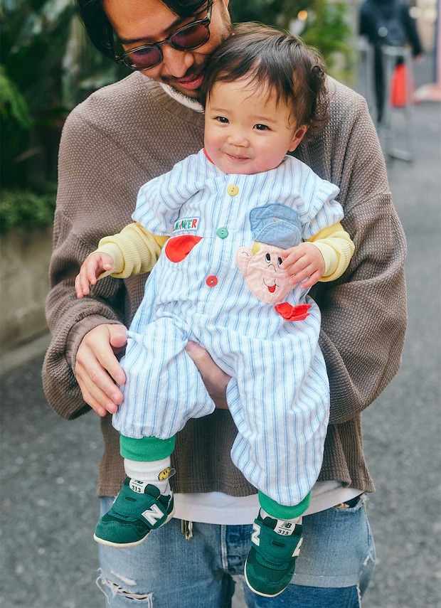 エンジニア気分を楽しめそうな、遊び心たっぷりのプリントが目を引くロンパースがお似合いの息子っちくん。やさしいイエローのロンTに『ニューバランス』のグリーンのスニーカーを合わせて、赤、黄、緑のカラフルな着こなしに。元気いっぱいで、思わず笑みが溢れるキュートなスタイリング♡