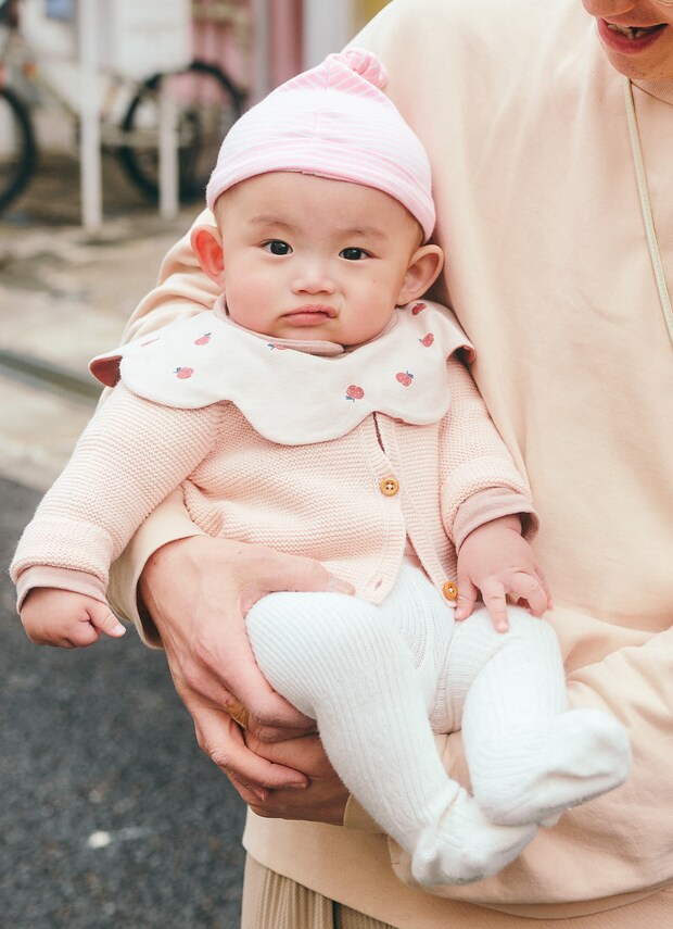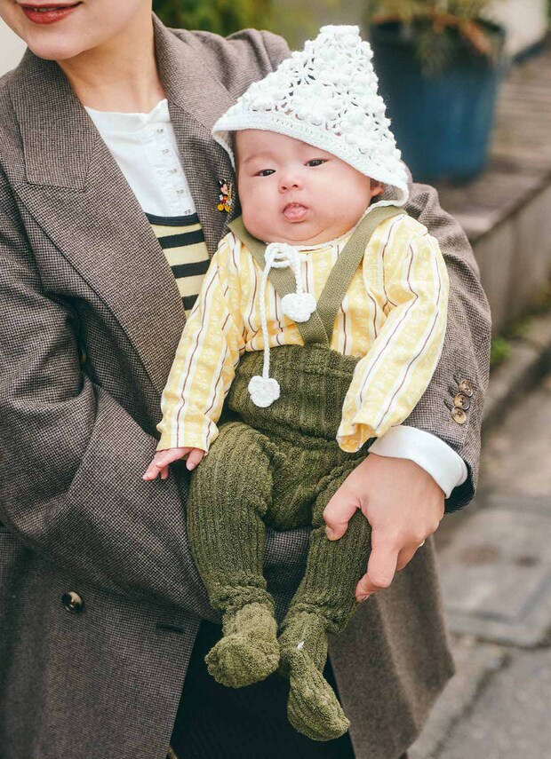 ペールピンクのカーディガンに温かみのある白のタイツを合わせたやわらかな雰囲気のeiraくん。ピンクの濃淡を重ねて、ストライプ柄のニット帽やリンゴ柄のスタイをさりげないアクセントにしたグラデーションコーデに。やわらかな配色に癒される、愛らしいスタイリング。
