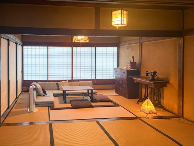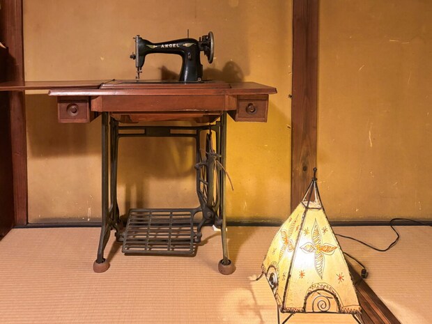 昔ながらの家具や雑貨がお迎えしてくれます。木綿産業の歴史を感じるミシンです。この横にも“あかり”が灯っています。柔らかな光でリラックスできそうですね。