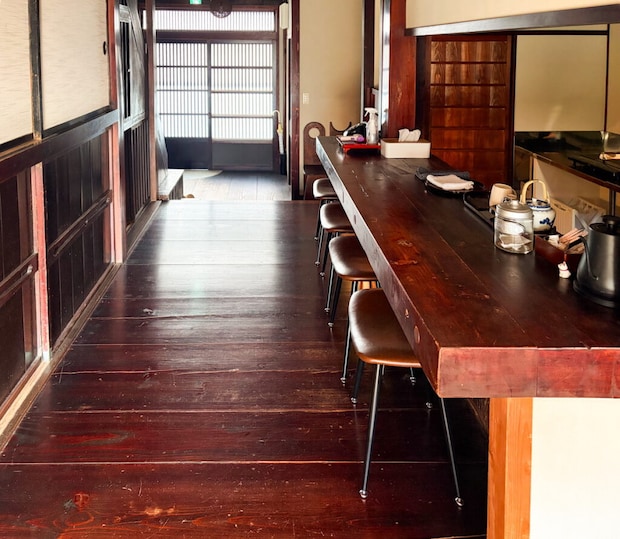 カウンターキッチンのようになっています。テーブルの木の傷から歴史を感じて、この建物が木綿街道と日々をともにしてきたことを物語っているようです。
