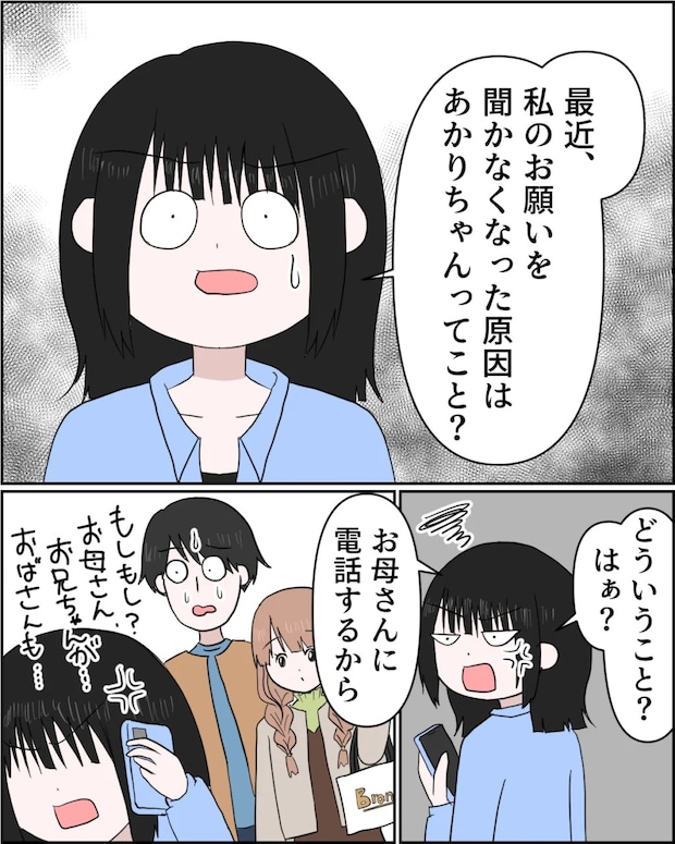 年の離れた妹の舞花さんを溺愛し、頼まれるがまま何でも買ってしまう夫の謙介さんにモヤモヤする妻の梓さん。誕生日プレゼントとして15万円もするカバンを舞花さんからねだられた謙介さんは「兄の威厳を保ちたい」という理由でカバンを贈ろうとしている様子。しかし、自分のお小遣いの金額をはるかに超えたプレゼントのため謙介さんはお小遣いの前借りや給料管理を任せてほしいと言い出しますが、金銭管理ができない謙介さんに家計を任せられるはずもなく、梓さんは即却下。一度は諦めたように見えたものの、その後謙介さんは頻繁に外出するようになり、クレジットカードの利用も増加。怪しんだ梓さんが謙介さんのスマホを見ると、義妹よりも年下の従妹あかりさんとの頻繁なやり取りを発見。社会人として相談に乗ってほしいと言われて連絡先を交換したようですが、謙介さんが送っている内容はデレデレのおじさん構文。あかりさんにスーツやバッグを買い与え、カップル限定ディナーのレストランに誘われ浮かれた様子の謙介さんに呆れた梓さんはしっかり釘をさし、しばらく大人しくなった謙介さん。しかし、ある休日に梓さんが念のためカードの利用明細を確認すると、なんとリボ払いの支払い履歴がありました。まさかと思いGPSで謙介さんの居場所を確認すると、位置情報は例のレストランになっていて、強い怒りを覚える梓さん。義実家へ向かった梓さんは、舞花さんに謙介さんから誕生日プレゼントを買ってもらったか確認し、まだ買ってもらっていないと言う舞花さんに一緒に見に行こうと言って連れ出しました。すると、梓さんの予想通り鼻の下を伸ばしてあかりさんと歩く謙介さんを発見。2人の姿に気づいた舞花さんは、あかりさんが持っているハイブランドのショッパーを見て「お兄ちゃん!」と鬼の形相で駆け寄りました。