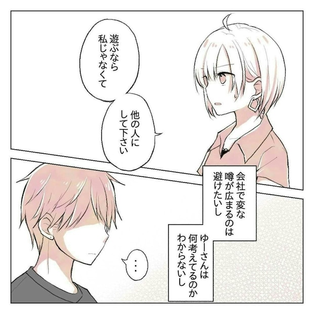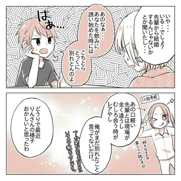 りんさんは、普段から飲みや遊びに強引に誘ってくる先輩・ゆーさんに対して、不信感を抱いていました。その最大の理由が「彼女がいる」というウワサ。ついに、本人に直接たしかめます。