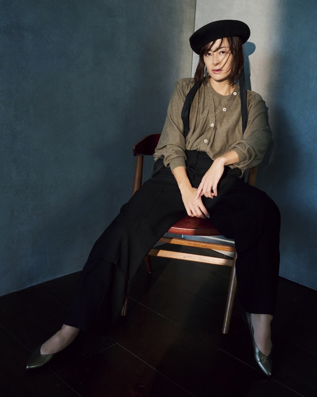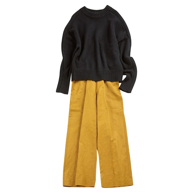 上質なニットを、ラフに着て。サテンのリボンが甘さとコケティッシュな魅力をプラスしてくれる。ざっくりニットもお似合いですが、こんなオトナなニットも素敵。ニット¥59,000、ワイドパンツ¥94,000(共にルメール/スクワット/ルメール)、ベレー帽¥40,700(シノナグモ/カオス表参道)、フラットシューズ¥28,600(ファビオ ルスコーニ/ファビオ ルスコーニ ジェイアール名古屋タカシマヤ店)