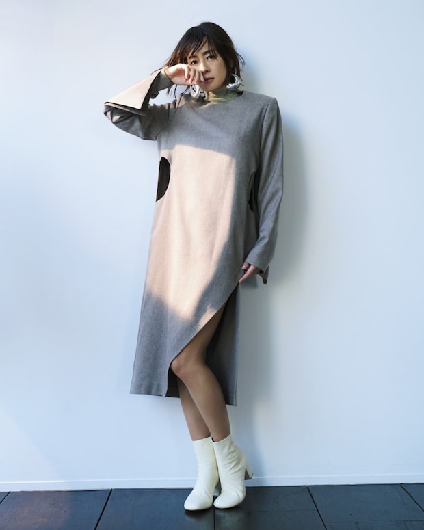 構築的なデザインは、ピアスとブーツでサラッと素直に着て。ドレス¥41,800(ハイク/ボウルズ)、シアートップス¥23,100(シモーネ ワイルド/エイチ ビューティ&ユース)、ピアス¥24,200(アダワットトゥアレグ)、ブーツ¥51,700(チェンバー/ユナイテッドアローズ 六本木ヒルズ店)
