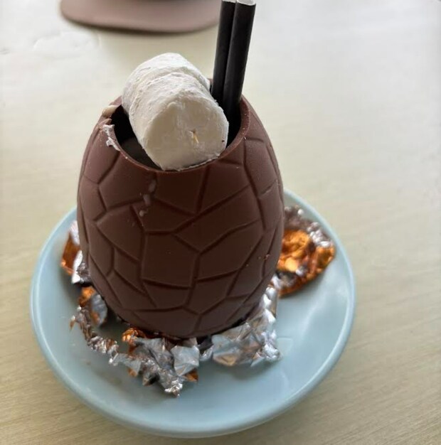 卵型のチョコレートの上部が割られていて、そこからドリンクを入れた器まで食べれる可愛いドリンクでした。
