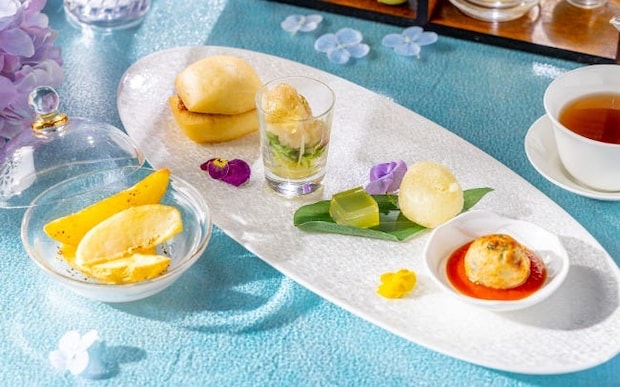 セイボリーにも、「露」のボタニカルな香りをまとわせた「エスカベッシュ」や「メロンのゼリー寄せ」など、ジンのドライな口当たりを活かした逸品が揃う。そのほかにも、初夏らしさと斬新さを兼ね備えた「ミルクの天ぷら メロン風味」や、満足感たっぷりの「黒毛和牛サーロインのチャイニーズバーガー」、トマトソースと味わう「海鮮チヂミボール」まで個性豊かなラインナップが用意されている。