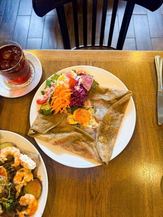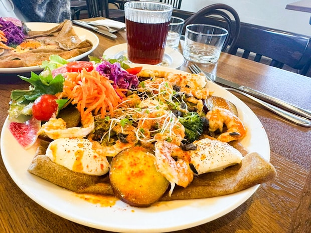 2026年4月14日 ゆったりと過ごすご褒美ランチ。出雲で味わうビストロ仕込みの本格ガレット|出雲市 na-na コンプット ( ハム ⌇卵⌇チーズ ) ¥1600 エビとアボカドとさつま芋とクリームチーズのガレット ¥2000 どちらもスープとサラダ付きです!ボリュームがしっかりあり、食べ終わる頃には満腹に。素材の組み合わせも絶妙で、ビストロならではの完成度の高いガレットです。 次ページ > 居心地の良さを大切にした空間 < 1 2 3 4 >