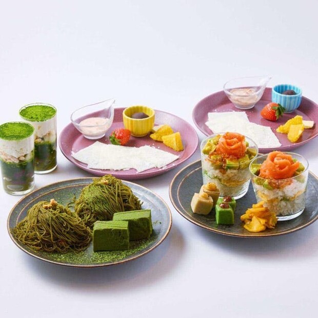ミニパフェやミニモンブラン、バスクチーズケーキなどのスイーツには、抹茶をふんだんに使用。自分で包む大福は、求肥に加え、季節のフルーツやこしあん、バターなどを用意。仕上げるひとときまで楽しめる、体験型の1品。ちらし寿司や生麩の田楽といったセイボリープレートも揃い、スイーツの合間のひと休みにも。さらに注目は、宇治茶の飲み比べ。玉露や煎茶、玄米茶、雁ヶ音など数種類の中から、お好みの2種類を選んでいただくことができるのでお楽しみに。