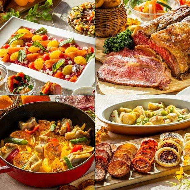 心地いい初夏の季節におすすめの、香りと酸味が爽やかなビュッフェが登場。ビュッフェには、スパイスの香りが食欲をそそる温製料理や、魚介のうまみあふれる冷製料理など、毎日約40種類の多彩なメニューがラインナップ。彩り豊かな「クスクスルージュのサラダ」、種類豊富に用意される「野菜の鉄板焼き」、食べ応え抜群の「ポークスペアリブのスパイス焼き」など、初夏にぴったりの爽やかさと彩りを添えた料理の数々が勢揃いする。さらに、「合鴨スモークとグレープフルーツのジュレ」や「オレンジ風味のチキンパエリア」など、柑橘を取り入れたディナー限定メニューも。