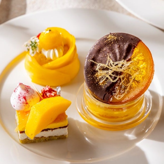なめらかな口あたりのプリンに果実感あふれる宮崎マンゴーを贅沢にあしらった「アルフォンソマンゴープリン」をはじめ、スモーキーなチョコレートをまとったオランジェットを、甘酸っぱいマンゴー&パッションフルーツのソースにディップして味わう独創的な1皿もラインナップ。ふんわりと軽やかな口どけの「マンゴー&ココナッツムース」は、ココナッツの柔らかな香りとマンゴーのみずみずしさが重なり合い、優雅なハーモニーを奏でる。