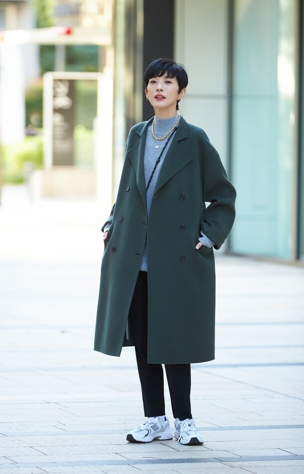 「軽やかなダブルフェイスのコートはオリーブカラーを選び、アイスグレーのニットとの配色を楽しんでいます。ブラックのスティックパンツで全体を引き締め、足元はスニーカーでスポーティに」