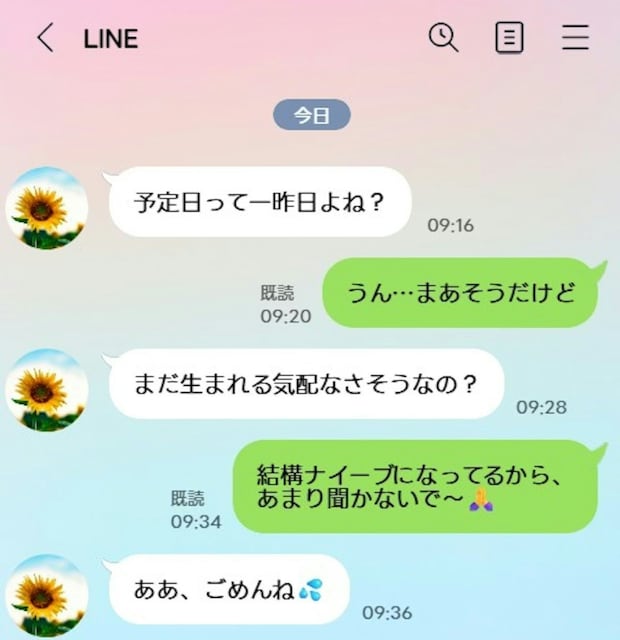 実母も予定日前から「産まれる気配なさそう?」とLINEと直接で2回も。