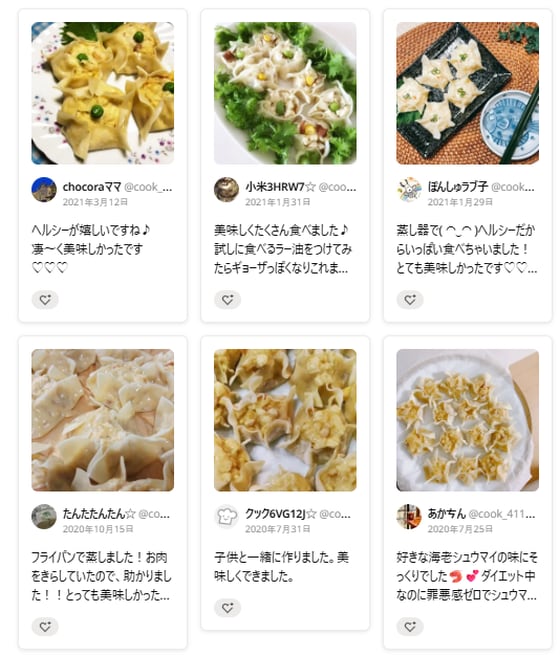 つくれぽ(つくりましたフォトレポートのこと)にも「お肉無しなのに、ちゃんと美味しい!ちゃんとシュウマイ!」「原料メインが豆腐なので罪悪感なく何個も食べれるヘルシーシュウマイでした。」など、絶賛コメントがたくさん届いています。