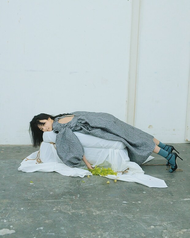 ドレス¥381,700(CECILIE BAHNSEN/ドーバー ストリート マーケット ギンザ)、靴下とアクセサリーは満島さん私物