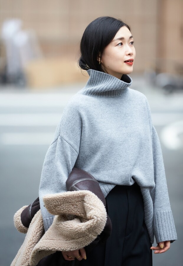 モノトーン合わせにも、色柄ものにも使える万能なグレーニットはヘビロテ確実。肌が弱い私でも着られる柔らかさがお気に入り。ニット¥23,100(ジャーナル スタンダード レサージュ)