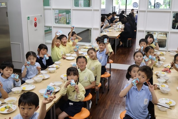 成蹊小学校の給食時間の様子。「キリン つよいぞ!ムテキッズ」を手にする児童たち